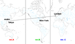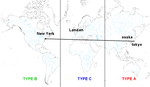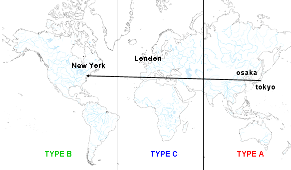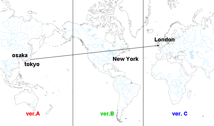 外れていることは十分に考えられる為、話半分で読む程度にしておいて下さい もしかしたら、条件変化の確率変動を世界旅行に喩えているのかもしれない 8/20 追記メモ 7/19 整理 7/15 追記 6/26 追記 6/13 大幅に修正 白地図はAbysse Corporation様のサイトのものを利用させて頂いております tokyo EVOLVED 未実験 難易度固定辺りか他の何かだと思われる 習楽踊激鬼かレベルかは不明 テーブルが出来るとすれば、難易度かレベルが要素となることが考えられる 修正(6/13) 現時点でも未実験状態だが、New Yorkの条件で考えると、1プレイ内での習楽踊激鬼の固定度合である可能性が考えられる 追記(7/15) Londonの条件を調べる際に習楽踊激鬼をバラけさせると出現曲が変化した為、数値ではないと思われる osaka EVOLVED Tから始まるアーティストで固定したら6連続でTYPE 2を引き、Lから始まるアーティストで固定したらTYPE 1が来た CANDY☆を4曲選択してEXTRAへ突入した時もTYPE 1、Jから始まるアーティストで固定した場合はTYPE 3が来た 修正(6/13) 曲名とアーティスト名の頭文字の一致具合の可能性がある 曲名自体の頭文字とアーティスト名自体の頭文字、曲名とアーティスト名の頭文字の3種類 組み合わせでのテーブルがあるかどうかは不明 調べられず仕舞い New York EVOLVED 難易度・曲名の頭文字・アーティスト名の頭文字を1プレイ内で揃えた量によって確率が変動するという条件だと予想 例えば、3曲設定中3曲ともTAG feat. Sydney PowersのTake A Step Forwardの楽をプレイしてEXTRAへ進出した場合はTYPE Bが高確率で出現という感じ 図で表すと、揃えると揃えただけ以下の様に確率が変動する予想 また、3種類完全一致と3種類完全不一致は不動と地球一周とという感じで全く同一の分岐をすると考えられる 恐らく、時間で分岐先が変化する London EVOLVED 9回試してAが6回、Bが3回 9回中8回が同曲・同アーティスト縛りでほぼ難易度も楽や踊で固定していた ということで、上記3曲の分岐条件を満たさない選曲をすることがver.Cを出現させる条件かと考えられる C以外の各ver.への分岐条件は以下と予想 追記(7/15) 7/15は17:30から始めた ・曲名の頭文字・アーティスト名の頭文字を一致、難易度(習楽踊激鬼)のみ完全にバラけさせて同じ曲を選択し続ける →ver.C×2 1. Theory of Eternity(鬼激踊楽) 2. Take A Step Forward(踊習楽激) ・曲名の頭文字・アーティスト名の頭文字・難易度の全てを完全にバラけさせて選択 →ver.A×2 1. La libertad鬼 Programmed Universe激 roppongi EVOLVED踊 Amalgamation楽 2. Sakura Sunrise激 Unbelievable(Sparky remix)踊 Diamond Dust鬼 Blind Justice~Torn souls, Hurt Faiths~楽 ・曲名の頭文字・アーティスト名の頭文字・難易度の全てを完全に一致させて選択 →ver.A 1. Theory of Eternity踊 ・難易度(習楽踊激鬼)のみ完全に一致させて、曲名の頭文字・アーティスト名の頭文字を完全にバラけさせた上で同じ曲を選択し続ける →ver.B 1. POSSESSION楽 21:00を過ぎた頃 C→A A→B ・曲名の頭文字・アーティスト名の頭文字を一致、難易度(習楽踊激鬼)のみ完全にバラけさせて同じ曲を選択し続ける →ver.A 1. Take A Step Forward(習激楽踊) ・曲名の頭文字・アーティスト名の頭文字・難易度の全てを完全にバラけさせて選択 →ver.B 1. La libertad鬼 Programmed Universe激 roppongi EVOLVED踊 Amalgamation楽 日本をver.A、アメリカをver.B、イギリスをver.Cとすると東京や大阪からニューヨークを越えてロンドンへ向かうという具合で日本から離れれば離れるほどバージョンも変化するという具合ではないだろうか また、条件が逆ということでNew Yorkとは進行方向も逆にした状態 図で表すと、ばらすとばらしただけ以下の様に確率が変動する予想 この理屈だと、既存の条件はver.Cへ向かう為の枷となる感じ 上記の条件が正しいのであれば、当然ながらテーブルは存在しない また、New Yorkと同様に3種類完全一致と3種類完全不一致は不動と地球一周とという感じで全く同一の分岐して、時間によって分岐先も変化すると思われる 東京・大阪・New York・Londonがある時間(午後9時とか)を迎えるとテーブルが切り替わるとかかも 追記メモ 8/18にプレイした時は17時で変わった気がする 東京 大阪 New York London 0 23:44 10 15 1 0:44 11 16 2 1:44 12 17 3 2:44 13 18 4 3:44 14 19 5 4:44 15 20 6 5:44 16 21 ――――――――――――― 7 6:44 17 22 8 7:44 18 23 9 8:44 19 0 10 9:44 20 1 11 10:44 21 2 ――――――――――――― 12 11:44 22 3 13 12:44 23 4 14 13:44 0 5 15 14:44 1 6 16 15:44 2 7 17 16:44 3 8 18 17:44 4 9 19 18:44 5 10 20 19:44 6 11 21 20:44 7 12 ――――――――――――― 21 ――――――――――――― 22 21:44 8 13 23 22:44 9 14 上記の時刻テーブルの中で、どれが適用されるかはゲーム開始時の時刻に決定すると思われる 今週でEXTRAツアーも終りだが、Londonが1回だけ調べる機会がある様なので、Londonは出現条件をもう1度調べる また、上ではテーブルの変化を C→A A→B と表記しているが、実際は C→B→A A→C→B の可能性がある 4曲設定でも3曲目までしか影響がないかどうかは検証していないので不明だが、4曲設定なら4曲とも条件の対象だと思われ